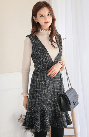 ジャンバースカート ツイード ミニ丈 膝上 ブラック系 冬 防寒 S M L XL 送料無料